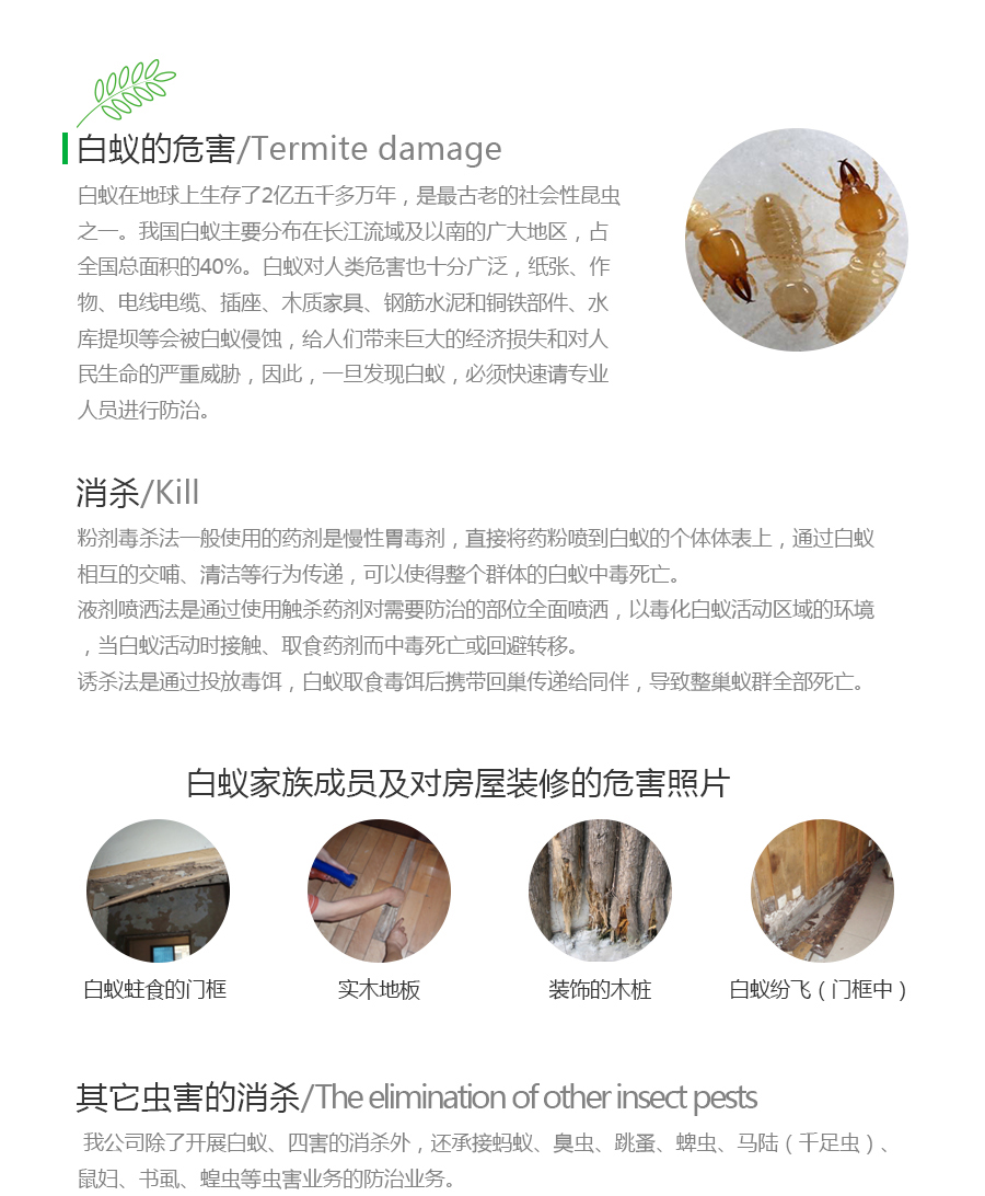 專業(yè)從事除四害防治公司,包含:滅蚊蠅、滅鼠、滅蟑螂、滅白蟻等有害生物的防制、環(huán)境消毒及有關(guān)消殺藥品與器械銷售等服務