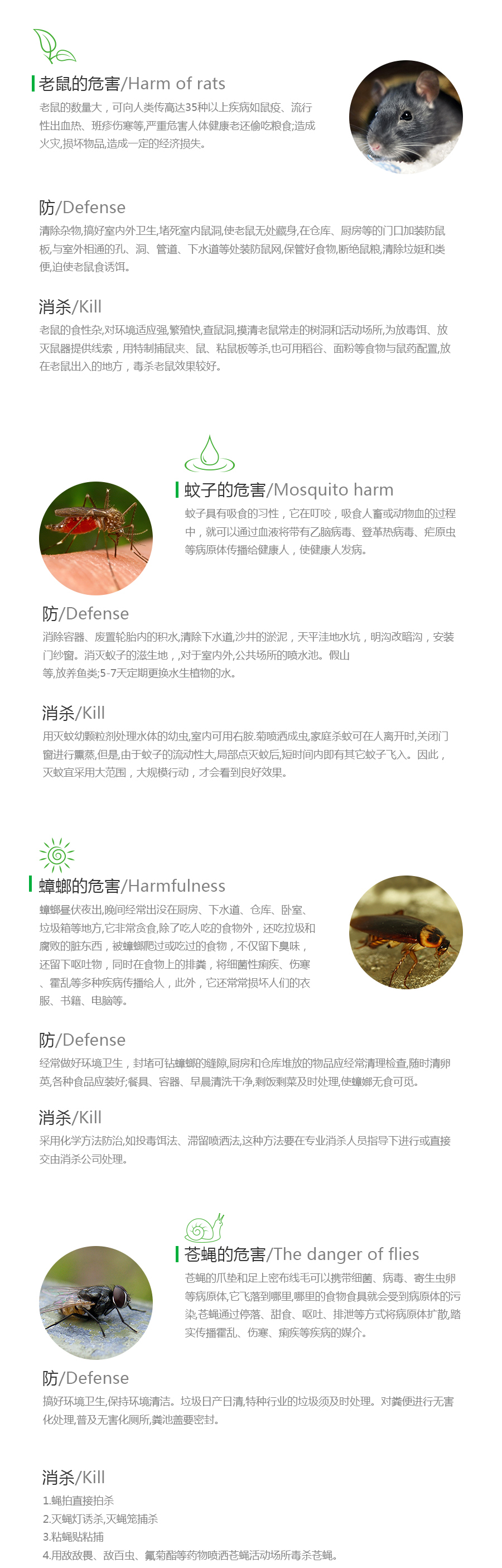 專業(yè)從事除四害防治公司,包含:滅蚊蠅、滅鼠、滅蟑螂、滅白蟻等有害生物的防制、環(huán)境消毒及有關(guān)消殺藥品與器械銷售等服務(wù)